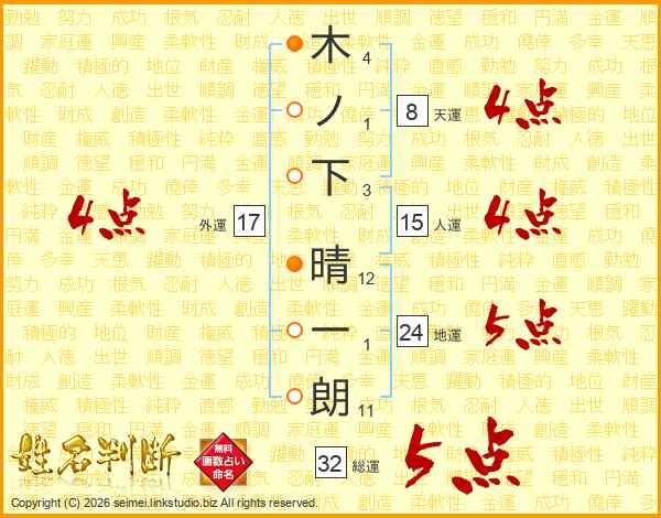 木ノ下晴一朗さんの総運は32画の5点!
