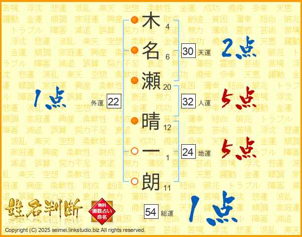 木(4画)名(6画)瀬(20画) 晴(12画)一(1画)朗(11画)