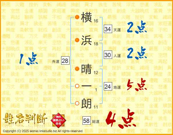横(16画)浜(18画) 晴(12画)一(1画)朗(11画)