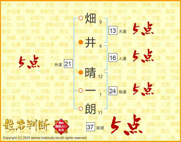 畑(9画)井(4画) 晴(12画)一(1画)朗(11画)