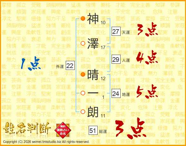 神(10画)澤(17画) 晴(12画)一(1画)朗(11画)