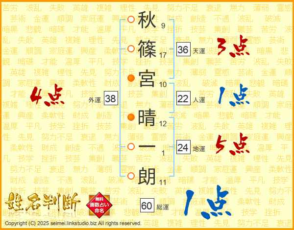 秋(9画)篠(17画)宮(10画) 晴(12画)一(1画)朗(11画)
