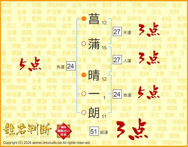 菖蒲晴一朗さんの総運は51画の3点!