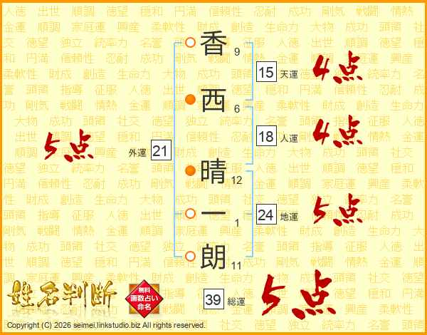 香西晴一朗さんの総運は39画の5点!