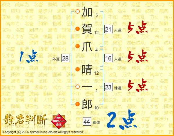 加(5画)賀(12画)爪(4画) 晴(12画)一(1画)郎(10画)