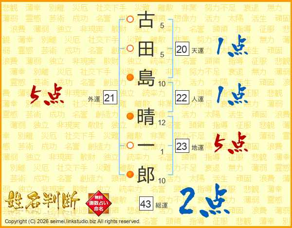 古(5画)田(5画)島(10画) 晴(12画)一(1画)郎(10画)
