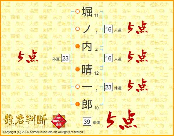 堀(11画)ノ(1画)内(4画) 晴(12画)一(1画)郎(10画)