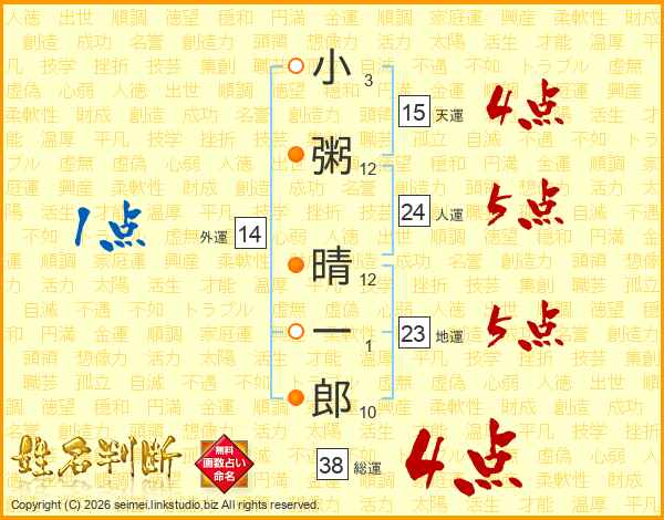 小(3画)粥(12画) 晴(12画)一(1画)郎(10画)
