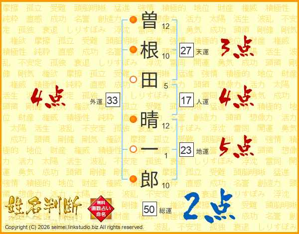 曽(12画)根(10画)田(5画) 晴(12画)一(1画)郎(10画)