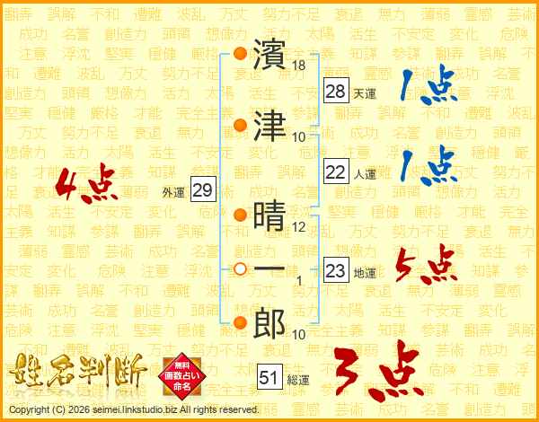 濱(18画)津(10画) 晴(12画)一(1画)郎(10画)
