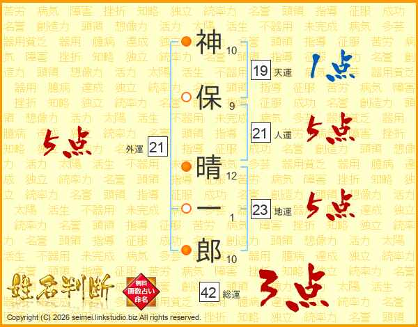 神(10画)保(9画) 晴(12画)一(1画)郎(10画)