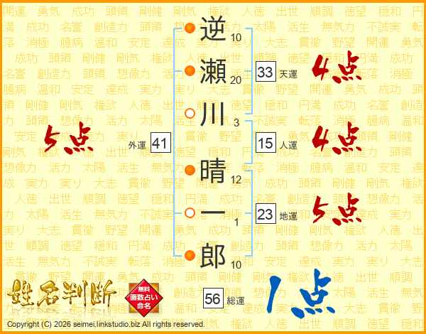 逆(10画)瀬(20画)川(3画) 晴(12画)一(1画)郎(10画)