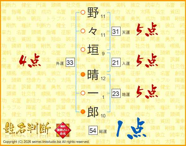 野(11画)々(11画)垣(9画) 晴(12画)一(1画)郎(10画)