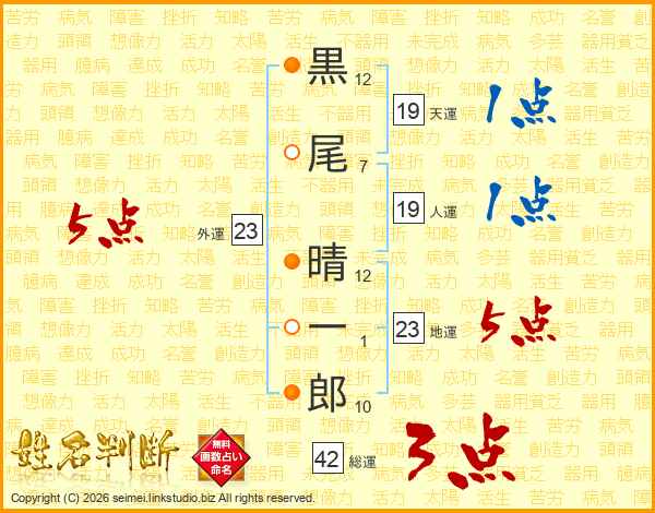 黒(12画)尾(7画) 晴(12画)一(1画)郎(10画)