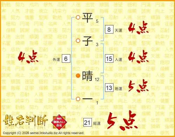 生活面を象徴する運勢です。外部から受ける影響力を表し、結婚運、家庭運や職場、環境への順応性を表します。総運から人運を引いた画数。姓や名が1文字の場合を除く。