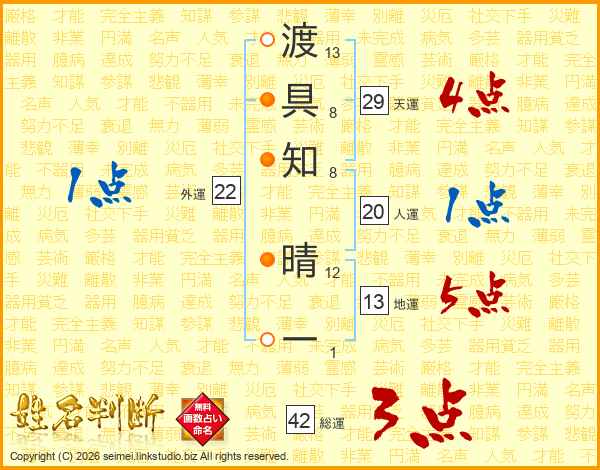 渡(13画)具(8画)知(8画) 晴(12画)一(1画)