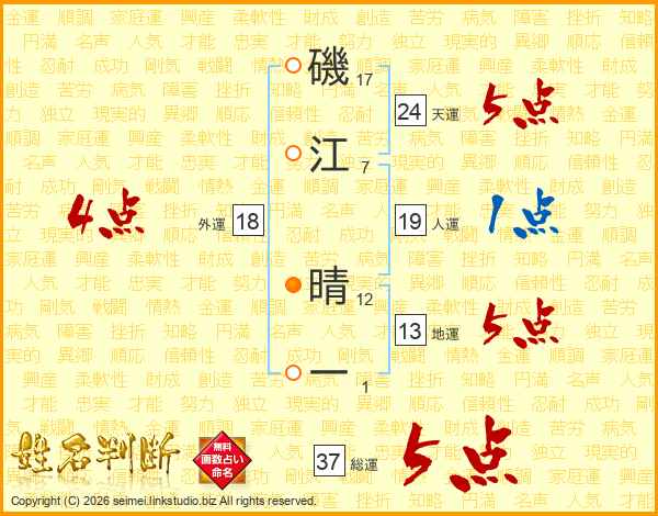 磯江晴一さんの総運は37画の5点!