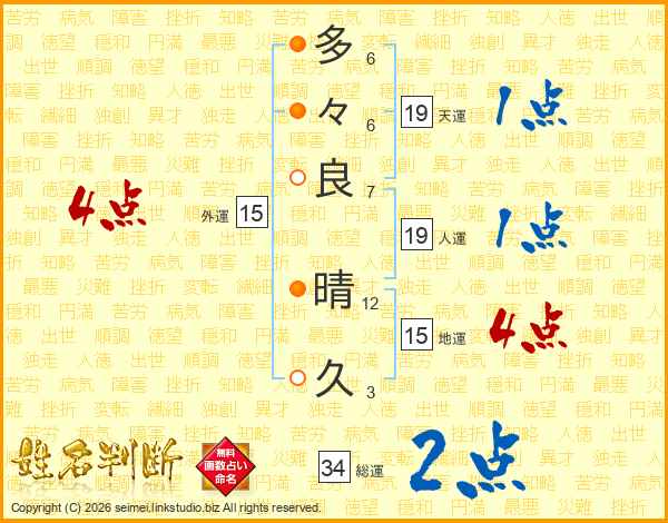 多(6画)々(6画)良(7画) 晴(12画)久(3画)