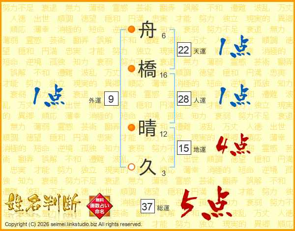舟(6画)橋(16画) 晴(12画)久(3画)