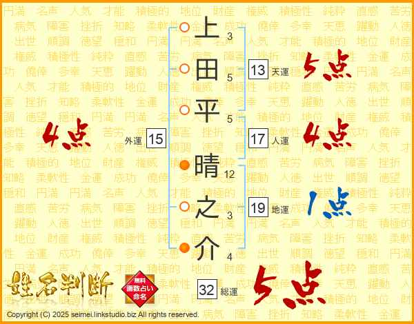 上(3画)田(5画)平(5画) 晴(12画)之(3画)介(4画)