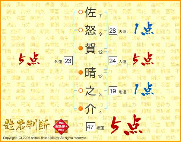佐怒賀晴之介さんの総運は47画の5点!
