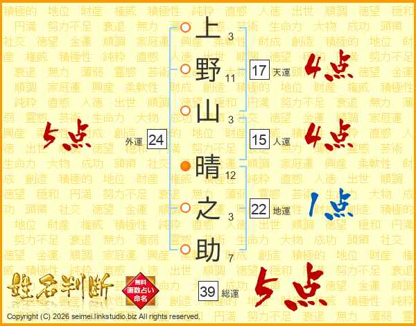 上(3画)野(11画)山(3画) 晴(12画)之(3画)助(7画)