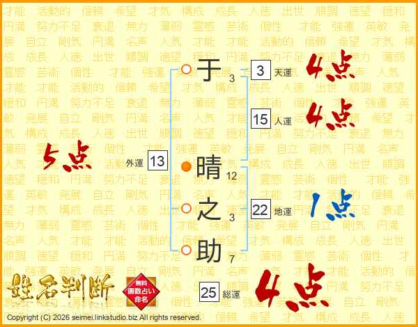 于晴之助さんの総運は25画の4点!