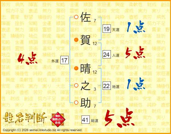 佐賀晴之助さんの総運は41画の5点!