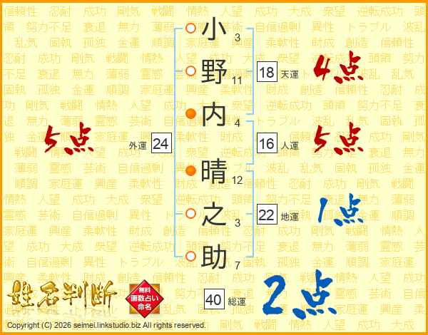 小(3画)野(11画)内(4画) 晴(12画)之(3画)助(7画)
