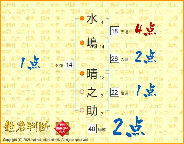 水(4画)嶋(14画) 晴(12画)之(3画)助(7画)