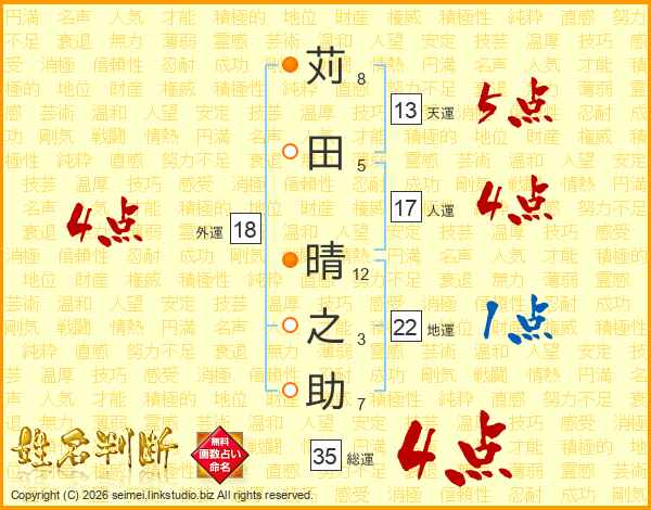 苅田晴之助さんの総運は35画の4点!