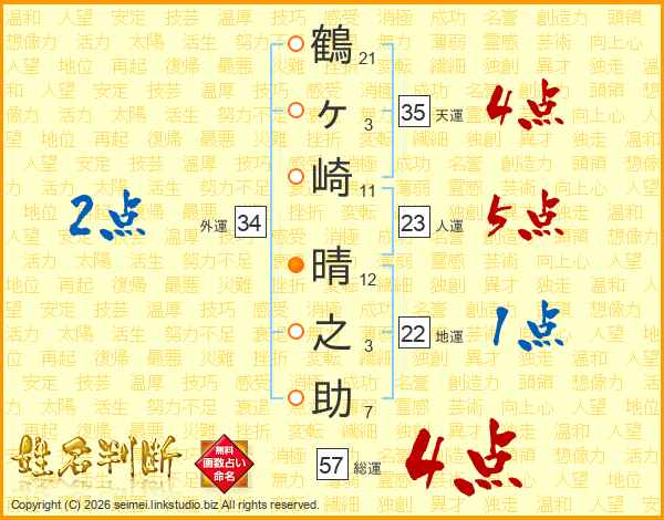 鶴ヶ崎晴之助さんの総運は57画の4点!