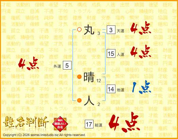 生活面を象徴する運勢です。外部から受ける影響力を表し、結婚運、家庭運や職場、環境への順応性を表します。総運から人運を引いた画数。姓や名が1文字の場合を除く。
