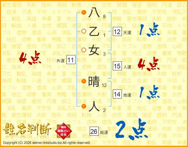 八乙女晴人さんの総運は26画の2点!