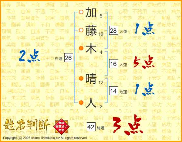 加藤木晴人さんの総運は42画の3点!