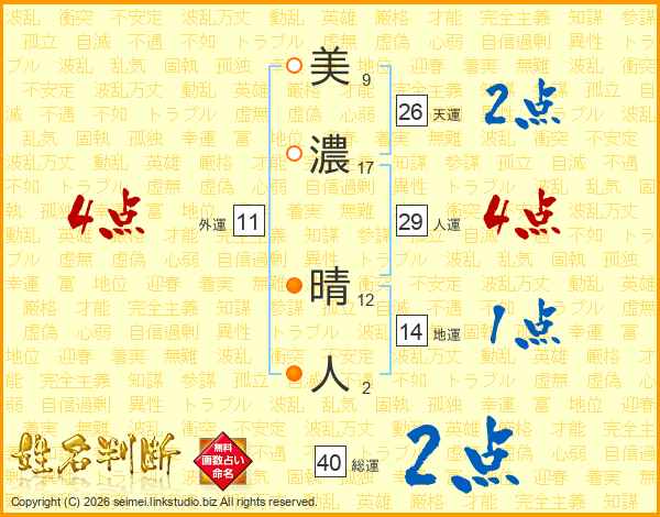 生活面を象徴する運勢です。外部から受ける影響力を表し、結婚運、家庭運や職場、環境への順応性を表します。総運から人運を引いた画数。姓や名が1文字の場合を除く。