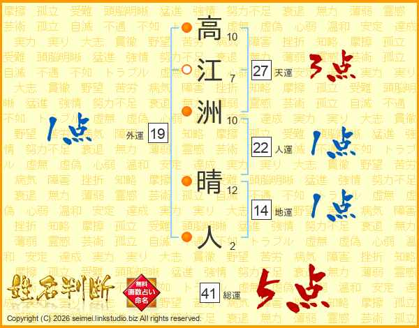 高(10画)江(7画)洲(10画) 晴(12画)人(2画)