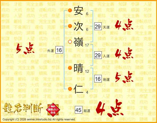安(6画)次(6画)嶺(17画) 晴(12画)仁(4画)