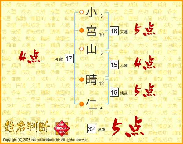 小宮山晴仁さんの総運は32画の5点!