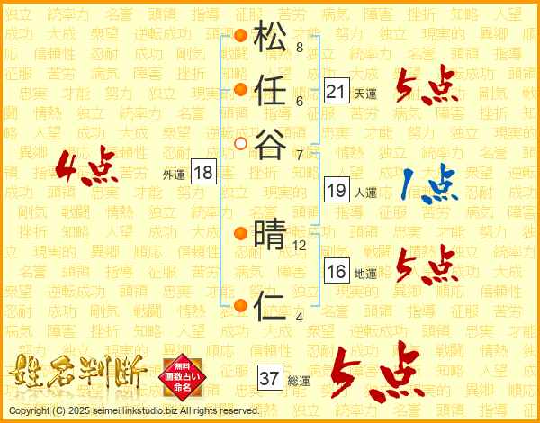 松任谷晴仁さんの総運は37画の5点!