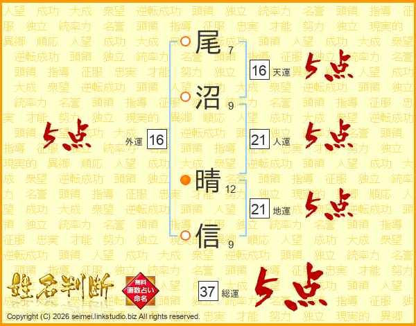 尾(7画)沼(9画) 晴(12画)信(9画)
