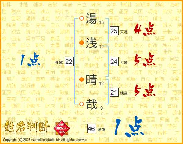 湯(13画)浅(12画) 晴(12画)哉(9画)