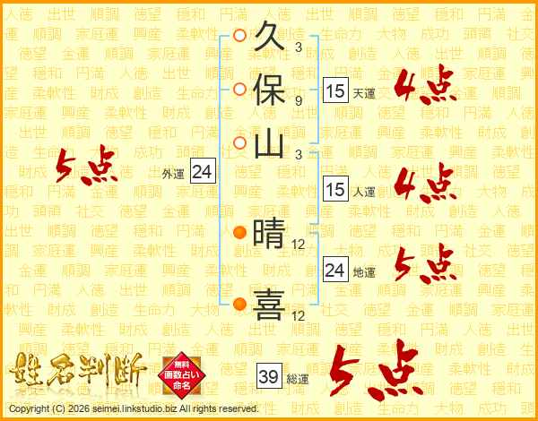 久(3画)保(9画)山(3画) 晴(12画)喜(12画)