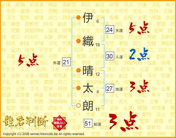 伊(6画)織(18画) 晴(12画)太(4画)朗(11画)
