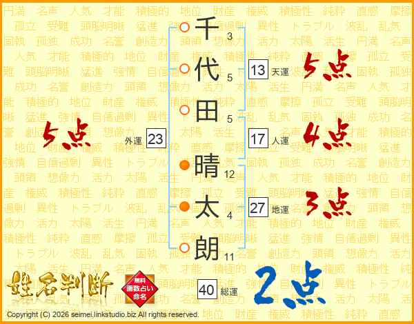 千代田晴太朗さんの天運は13画の5点!
