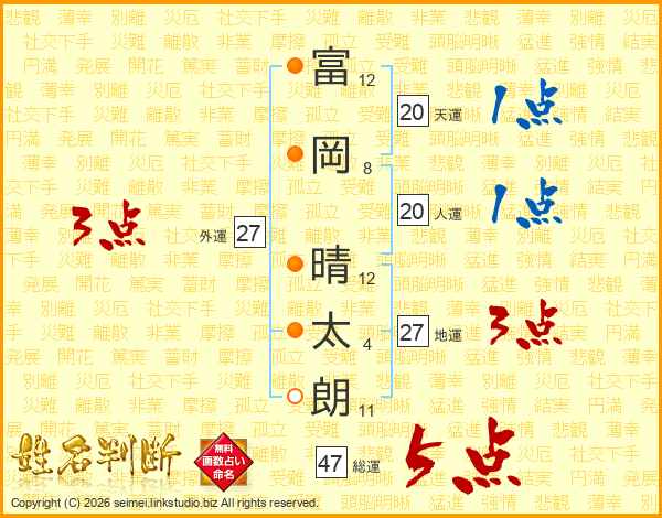 富(12画)岡(8画) 晴(12画)太(4画)朗(11画)