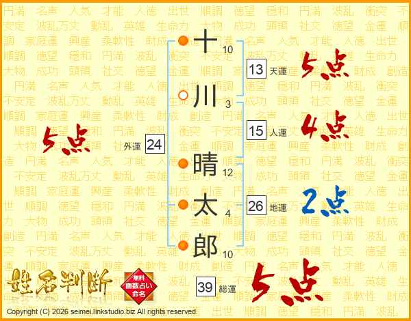 十川晴太郎さんの総運は39画の5点!