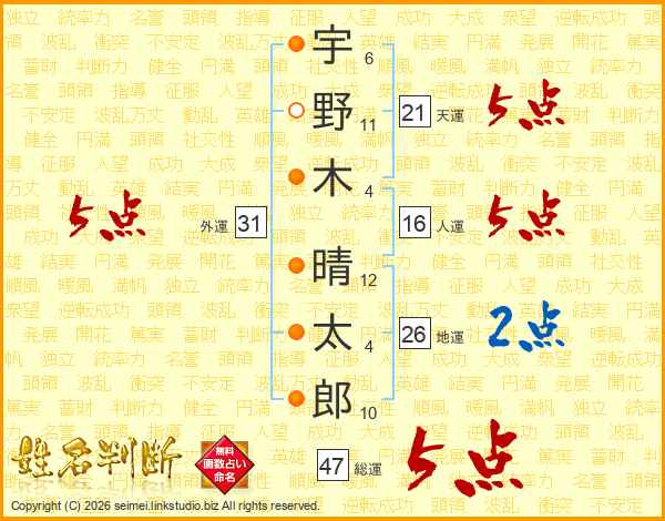 宇(6画)野(11画)木(4画) 晴(12画)太(4画)郎(10画)