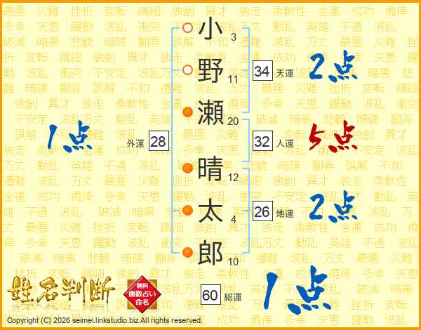 小(3画)野(11画)瀬(20画) 晴(12画)太(4画)郎(10画)