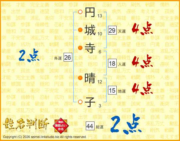 円(13画)城(10画)寺(6画) 晴(12画)子(3画)
